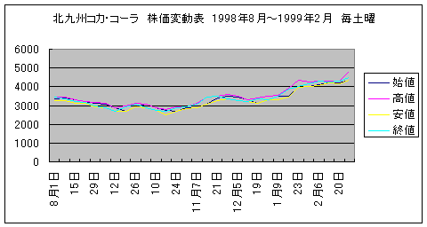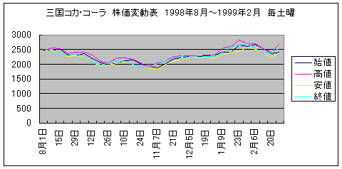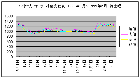 1998年にバレーボール世界選手権(世界バレー)の公式飲料だったコカ・コーラを調べた.日本で世界バレーが行われた1998年当時,東証一部に上場していたのは,北九州コカ・コーラ(現コカ・コーラウエストホールディングス),三国コカ・コーラ,中京コカ・コーラ(現コカ・コーラセントラルジャパン)である(資料@).株価を見ると,大きな上昇は大会後の1月にある.大会期間中の10月〜12月は特に変化は見られない.