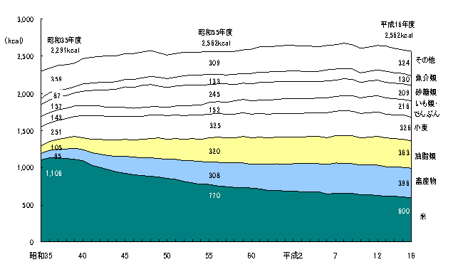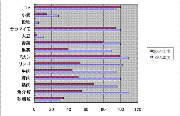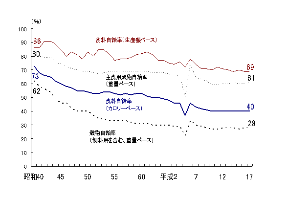 日本の食生活は戦後から西洋文化が入ってきて、野菜や魚や米中心の食生活から肉や油脂のどの多めに取る食事に変化した。1965年から2004年の間、畜産物と油脂の消費は2倍以上に膨らんだ。かたや主食であるコメの消費は半減している。もともと自給率の低かった畜産物や小麦や油脂類を食べて、自給率の高いコメを食べなくなるようにすれば自給率が落ちるのは当然である。