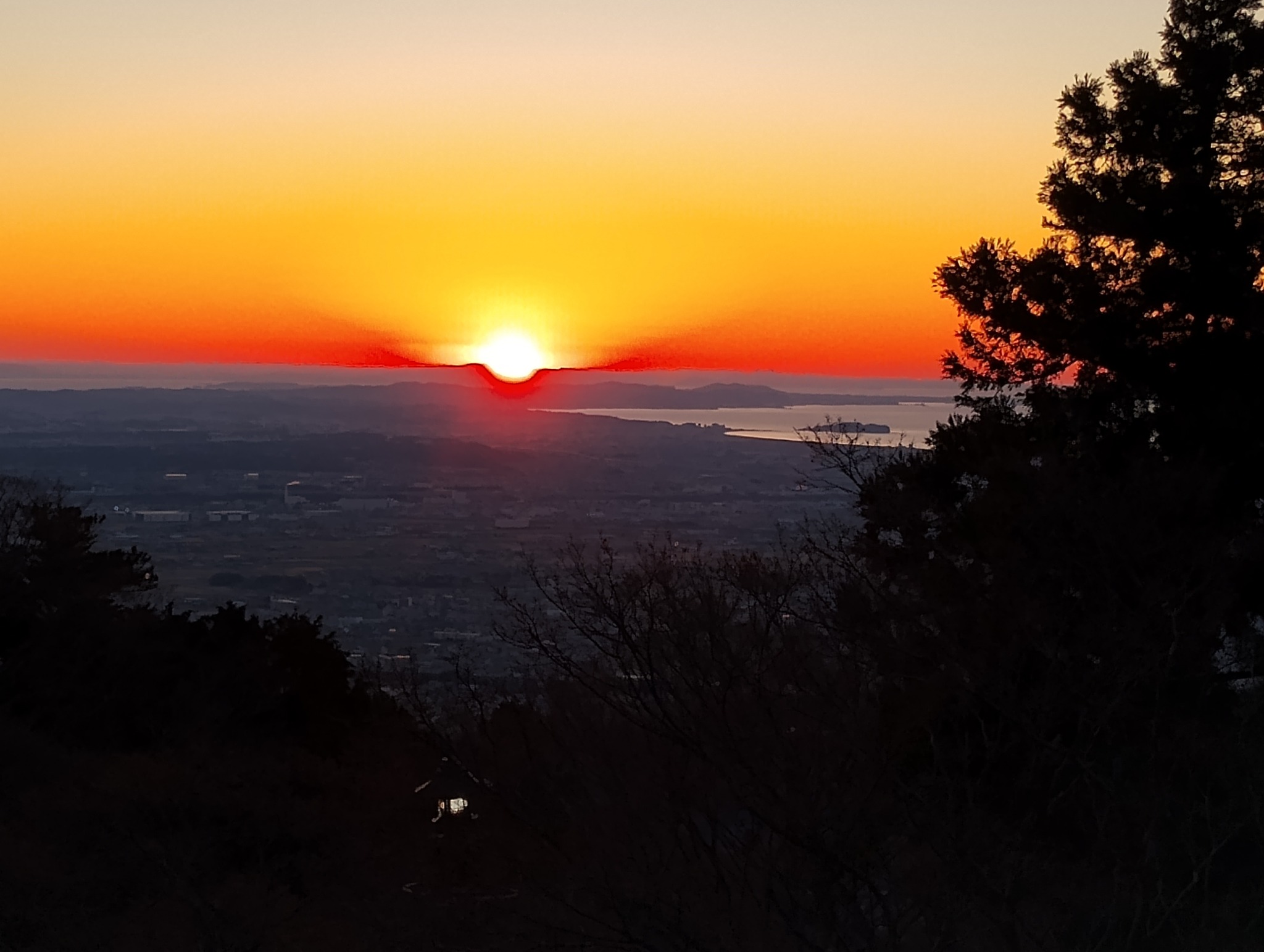 大山 阿夫利神社 下社から見た 江の島の向こうに上がった初日 (2025 年元旦)
