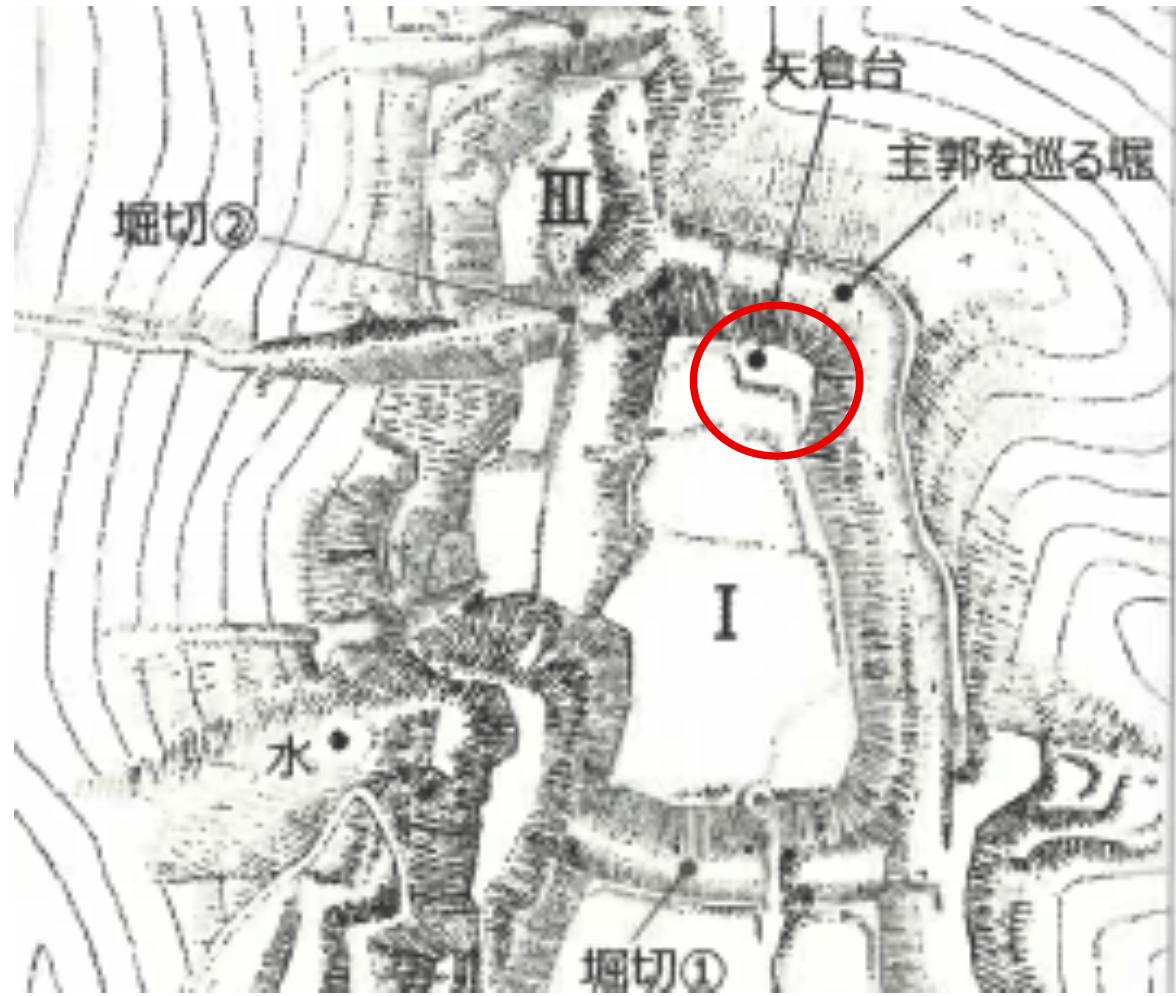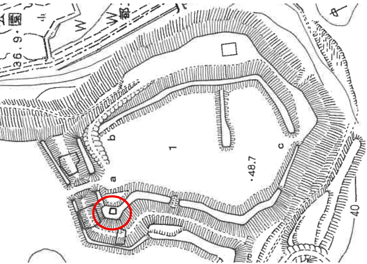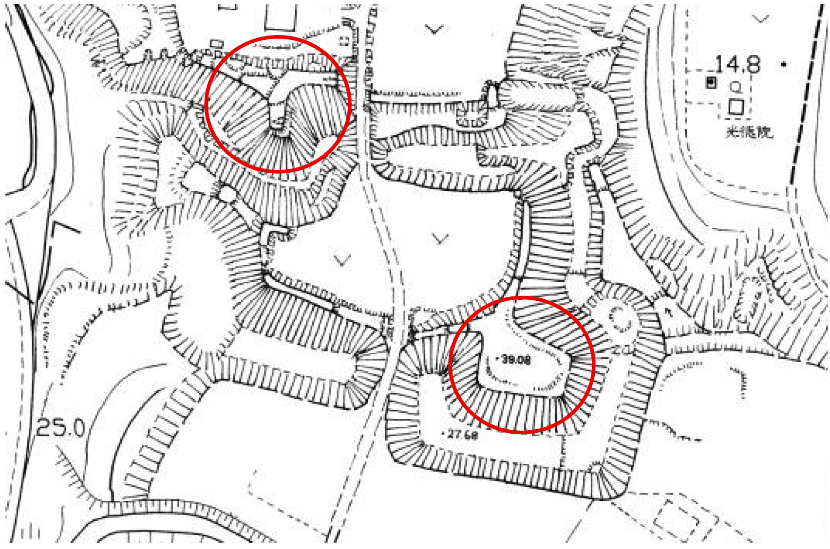 図7 高月城(東京都八王子市)(西股総生作図に加筆)(虎口の両側に櫓台。)