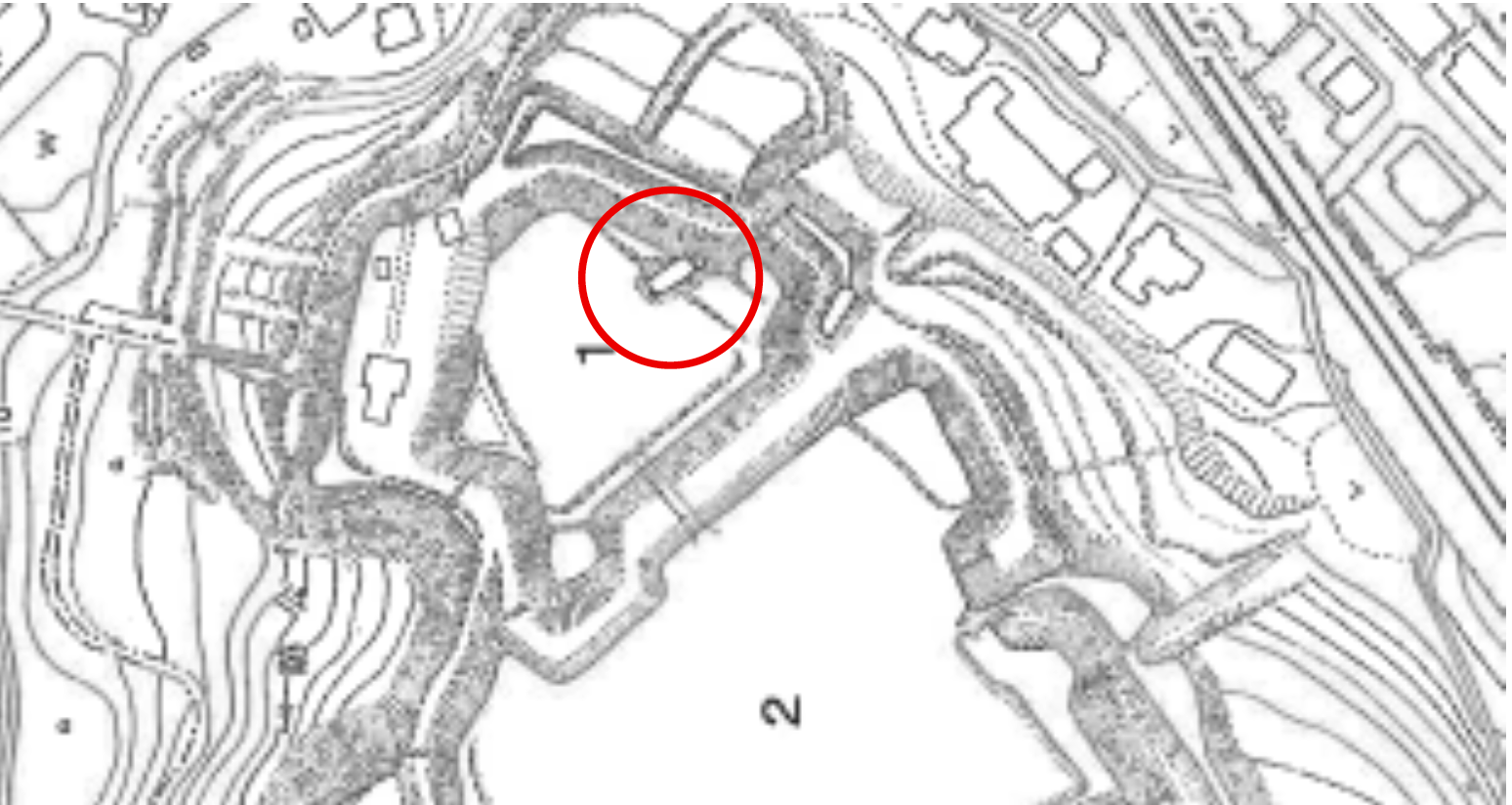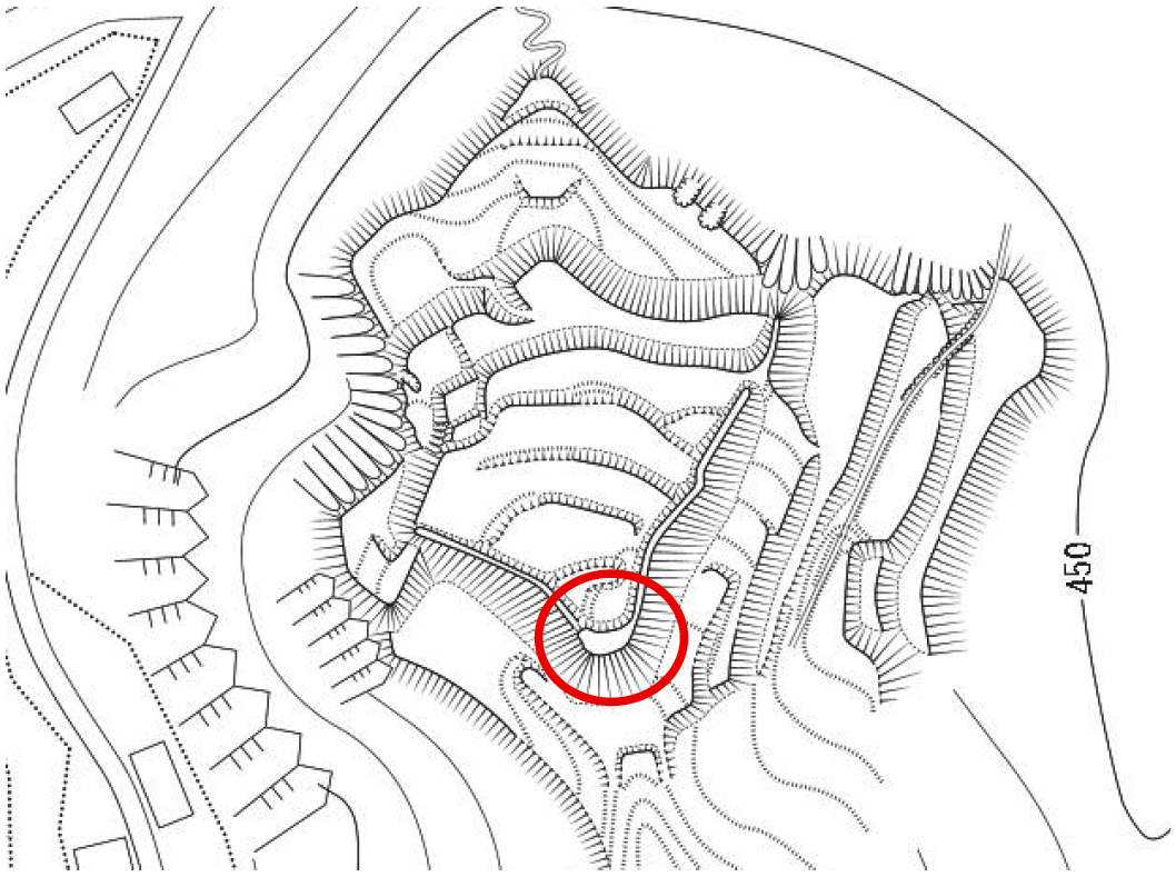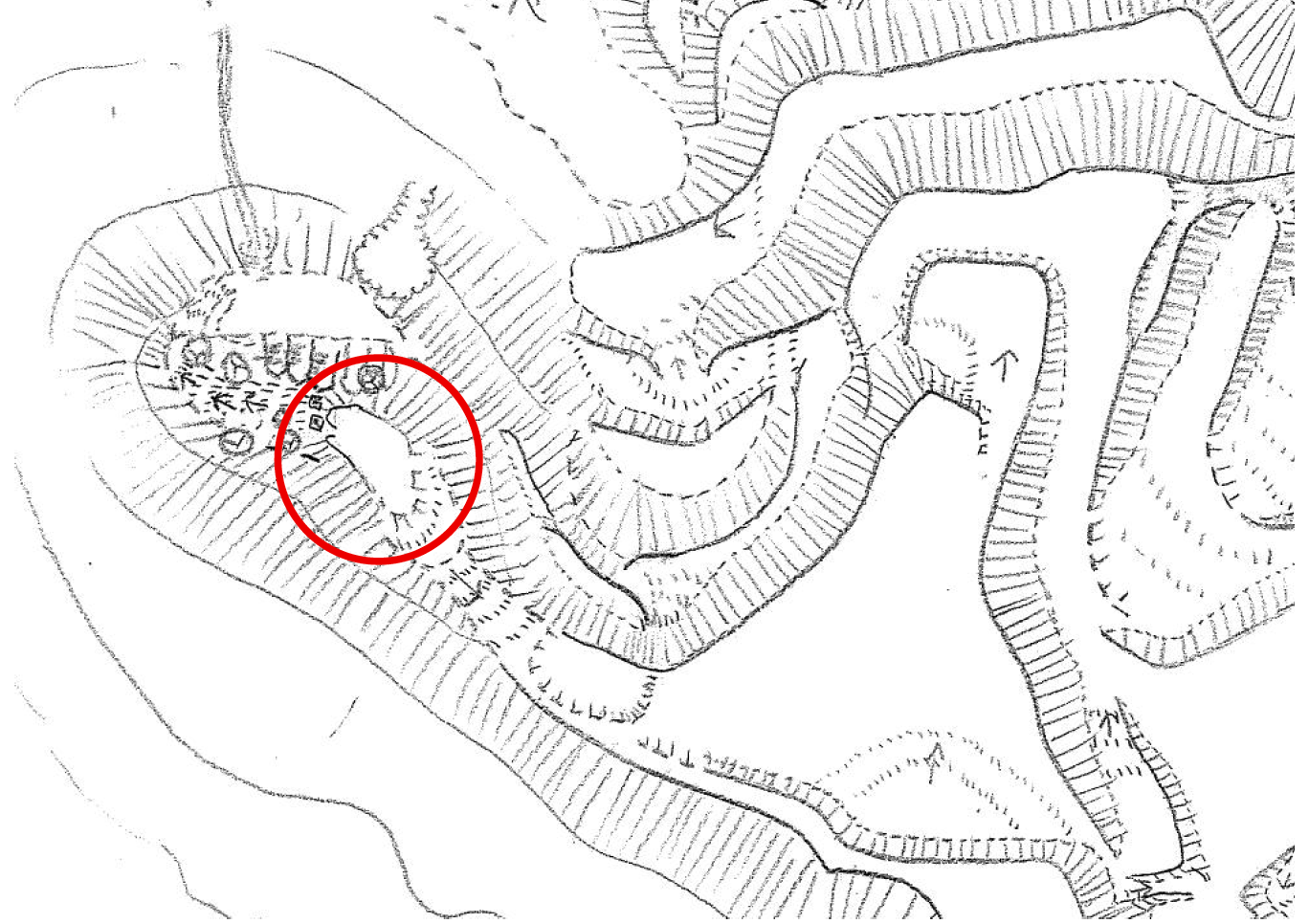 図7 高月城(東京都八王子市)(西股総生作図に加筆)(虎口の両側に櫓台。)