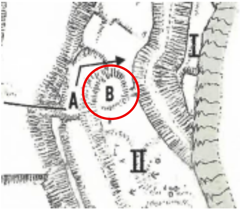 図6 八木岡城(栃木県真岡市)(渡邉昌樹作図に加筆)※虎口Aから矢印に侵入する敵を櫓台Bで制圧